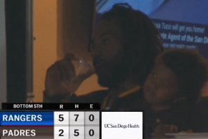 視頻中小卡和孩子在包廂內(nèi)觀看美職棒圣地亞哥教士和得州游騎兵的比賽,他拿著飲料滿臉笑容,看來心情不錯(cuò)。