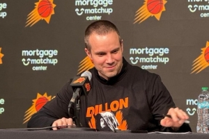 體育資訊1月30日訊 太陽(yáng)114-96輕取活塞。賽后,太陽(yáng)主帥奧特穿著印有“狄龍大反派”字樣的定制T恤接受媒體采訪。太陽(yáng)本場(chǎng)安排發(fā)放了5000件印有“狄龍大反派”的T恤,狄龍本場(chǎng)得到40分,刷新個(gè)人生涯新高。
