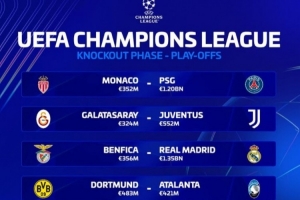 體育資訊1月30日訊 歐冠淘汰賽附加賽對陣已經出爐,《轉會市場》也列出了各隊的德轉身價情況?;蜀R和巴黎均超過10億歐元,博德閃耀和卡拉巴赫均未破億。