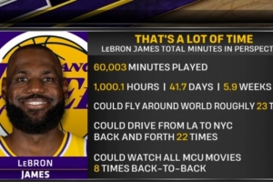 詹姆斯生涯至今出戰60003分鐘,可以換算為1000.1小時、41.7天、5.9周,能夠坐飛機環繞地球23圈,能夠開車從洛杉磯到紐約往返22次,可以連續8次觀看《復仇者聯盟》系列電影