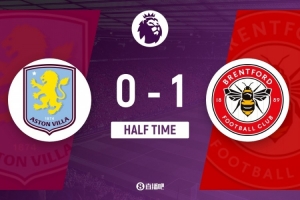 傷停補時4分鐘。上半場比賽結束,阿斯頓維拉0-1布倫特福德。
