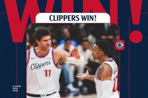 賽后快船官方發布贏球海報,封面為洛佩斯和科林斯擊掌瞬間。