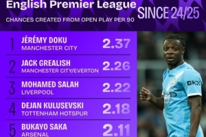 體育資訊2月3日訊 “Squawka”統計了上賽季開始至今,每90分鐘創造運動戰機會最多的前十位英超球員(只統計創造50次機會以上的球員)。曼城邊鋒多庫以場均2.37次領跑榜單。