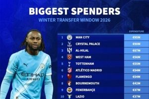 體育資訊2月4日訊 冬季轉會窗已經關閉,德國轉會市場盤點了足壇各隊引援花費情況,曼城以9500萬歐居首,水晶宮以9000萬歐位居次席。