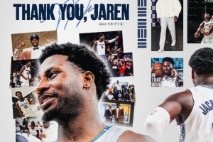 灰熊官推隨后曬圖,感謝小賈倫·杰克遜八年來為灰熊所做的貢獻。官推列舉了期間小賈倫獲得的榮譽:最佳新秀一陣、兩次全明星、兩屆蓋帽王、三次最佳防守陣容、一次最佳防守球員。