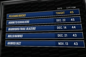 本場比賽雄鹿三分47中21,鵜鶘26中24,雙方合計命中45記三分,平本賽季單場最多。
