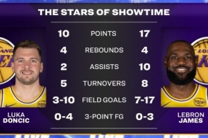賽后,轉播方曬出詹姆斯和東契奇本場的數據,東契奇傷退只打了16分鐘10投3中,三分4中0僅得10分,出現5次失誤;詹姆斯得到17分10助攻,但投籃17中7,三分3中0,還出現8次失誤。