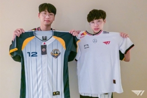 體育資訊7月7日訊 T1官方分享與CFO隊員交換隊服合影:明天加油!??