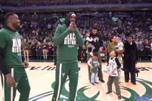 體育資訊2月7日訊 在今日雄鹿對陣步行者的賽前。波蒂斯攜手字母哥哥向字母哥致敬,并祝他連續10次進入全明星陣容。
