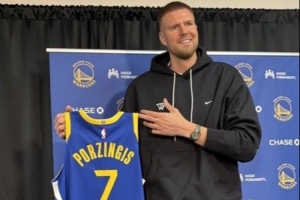 波爾津吉斯手持勇士7號球衣正式亮相。