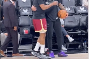 本場比賽是哈登的騎士生涯首秀,他賽前和2009屆的同級生德羅贊耳語寒暄。