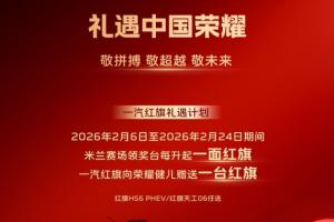 一汽紅旗在宣傳海報中寫道:米蘭賽場領獎臺每升起一面紅旗,一汽紅旗向榮耀健兒贈送一臺紅旗。