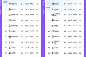 英超前六積分對比上賽季同期: