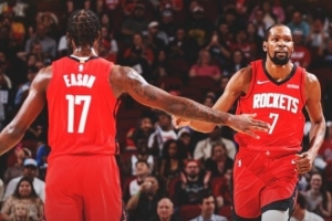 賽后火箭官方發布贏球海報,杜蘭特和伊森擊掌瞬間成為封面。