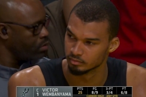 第一節,馬刺球星文班亞馬火力全開,打了8分鐘9投8中,三分4中3、罰球8中6砍下25分3籃板1搶斷1蓋帽,正負值+13。