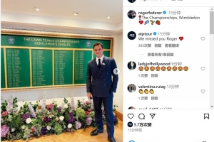 費德勒現場觀看溫網比賽,他在社交媒體上曬出照片,這位8屆賽會冠軍與溫網冠軍墻合影。