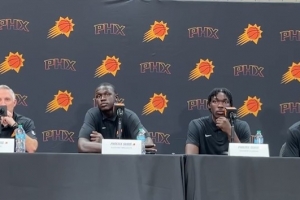 體育資訊7月8日訊 今天,太陽為球隊新秀舉行了新聞發布會。10號秀馬盧阿奇(圖左二)接受了采訪。
