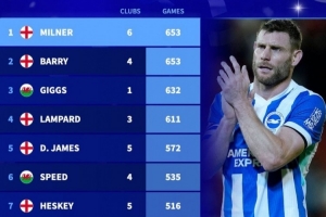 體育資訊2月12日訊 布萊頓在本輪英超對陣阿斯頓維拉,40歲米爾納替補出戰(zhàn)。數(shù)據(jù)統(tǒng)計顯示,他也追平巴里并列英超歷史出場王。