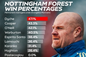 天空體育統計了馬里納基斯成為諾丁漢森林老板以來,歷任主帥的勝率,戴奇47.1%最高。