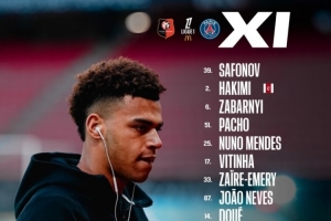 巴黎首發(fā):39-薩福諾夫、2-阿什拉夫、6-扎巴爾尼、51-帕喬、25-努諾·門德斯、17-維蒂尼亞、33-扎伊爾·埃梅里、87-若昂·內(nèi)維斯、14-杜埃、7-克瓦拉茨赫利亞、10-登貝萊