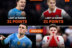 對(duì)比聯(lián)賽最后12輪的戰(zhàn)績(jī),22/23賽季,曼城31分阿森納21分。23/24賽季,曼城32分阿森納31分。24/25賽季,曼城27分阿森納21分。