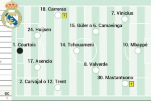 上輪停賽的維尼修斯此役回歸先發,前場三人還有姆巴佩以及馬斯坦托諾。右后衛位置卡瓦哈爾和阿諾德都可能在此役首發出戰,中場居萊爾以及卡馬文加將爭奪一個先發位置。
