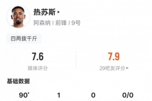 體育資訊2月16日訊 足總杯第4輪,阿森納4-0維岡競(jìng)技。熱蘇斯首發(fā)出戰(zhàn),1射門1射正打進(jìn)1粒進(jìn)球,另外他還有1次過人成功,但也有16次丟失球權(quán),評(píng)分7.6。