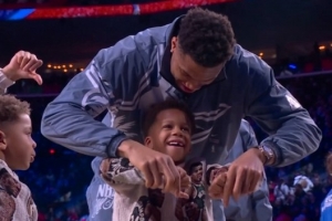 比賽中,倫納德化身戰勝卡,字母哥的兒子在場邊豎起大拇指為倫納德加油,作為世界隊的一員,字母哥趕緊按下兒子的雙手,并教他拇指向下噓。