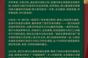 前路未必盡是坦途,風雨或許仍將伴隨。我們堅信,只要與你們并肩,便無懼任何挑戰。希望在新的一年里,我們繼續攜手同行,在工體一起吶喊,共同書寫屬于我們的故事,傳承這份始終如一的信念與熱愛。