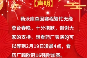 勒沃庫森因賽程繁忙無緣登臺春晚,十分抱歉,謝謝大家的支持。想看藥廠表演的可以等到2月19日凌晨4點,看藥廠踢歐冠16強附加賽。