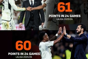 本賽季,皇馬在西甲24輪后拿到了60分,創造隊史第三高的24輪后積分。