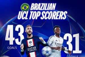 據歐冠官方統計,維尼修斯職業生涯至今在歐冠比賽中打進31球,超越卡卡(30球),巴西球員之中僅少于內馬爾(43球)。
