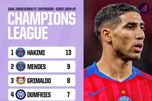 體育資訊2月18日訊 Opta統計了近兩個賽季后衛在歐冠比賽中參與進球的數量,并列出榜單,阿什拉夫參與13球居首。