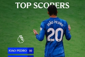 切爾西官方列本賽季隊內英超進球榜,若昂·佩德羅以10球居首,帕爾默、恩佐8球并列第二。