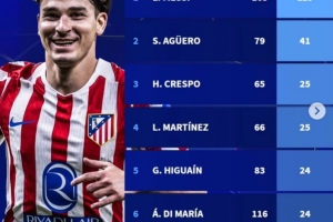 體育資訊2月19日訊 在歐冠附加賽馬競(jìng)3-3戰(zhàn)平布魯日的比賽中,阿爾瓦雷斯破門。以下為阿根廷球員在歐冠歷史進(jìn)球榜: