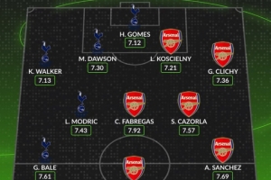 中場:貝爾(熱刺)、莫德里奇(熱刺)、法布雷加斯(阿森納)、卡索拉(阿森納)、桑切斯(阿森納)