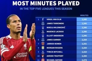 本賽季五大聯賽球員出場時間排行榜