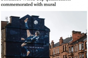 這幅由阿迪達(dá)斯委托創(chuàng)作的壁畫于周五在蘇格蘭隊(duì)主場(chǎng)格拉斯哥球場(chǎng)外揭幕,以紀(jì)念“蘇格蘭歷史上最偉大的進(jìn)球之一”。