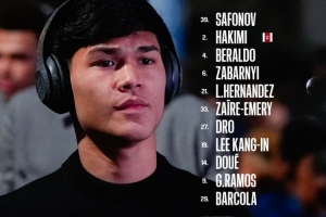 39-薩福諾夫、2-阿什拉夫、4-貝拉爾多、6-扎巴爾尼、21-盧卡斯、33-扎伊爾·埃梅里、27-德羅、19-李剛仁、14-杜埃、9-貢薩洛·拉莫斯、29-巴爾科拉