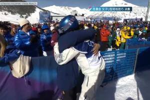 體育資訊02月22日訊 女子U型場地技巧決賽,谷愛凌第二輪得到94分,暫時位列第一,谷愛凌完成第二滑后到場邊與母親擁抱。