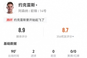 體育資訊2月23日訊 阿森納在本輪英超對陣熱刺,約克雷斯本場數據如下: