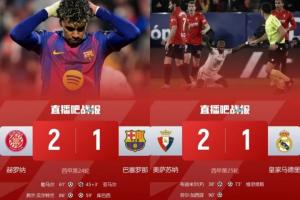而上輪西甲,巴薩也是在客場1-2遭赫羅納絕殺,早些時候4-1戰勝皇家社會的皇馬登頂。