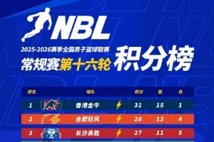 【積分榜】2025-2026賽季NBL常規賽積分榜(截至第十六輪結束)。