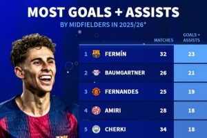 體育資訊2月24日訊 《轉會市場》統計了本賽季五大聯賽中場球員在各項賽事直接參與進球情況,費爾明領跑。