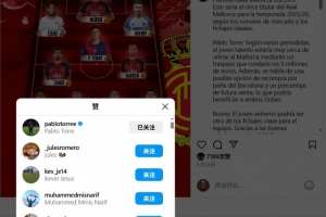 托雷明確表態只愿加盟馬略卡,并拒絕了阿賈克斯等歐洲其他俱樂部的邀約。事實上,他在社交媒體上點贊相關動態的舉動已引發關注。Instagram賬號aficionrcdm發布的馬洛卡下賽季潛在首發陣容中,托雷作為前腰與薩姆-科斯塔、塞爾吉-達德爾組成中場三角,而球員本人對該帖的點贊行為進一步點燃了球迷熱議。