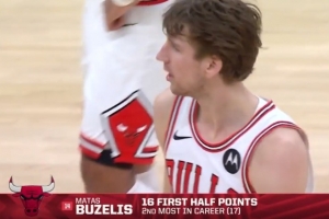 上半場比賽,公牛前鋒布澤利斯扛起球隊(duì)進(jìn)攻大旗,進(jìn)攻端里突外投效率不錯,他出戰(zhàn)18分鐘,12中7,三分6中2拿到16分4籃板1搶斷。