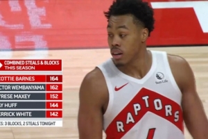轉播方統計,巴恩斯本賽季搶斷+蓋帽之和164次,超越文班排名聯盟第一。