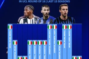 德轉統計了近15個賽季歐冠16強意甲球隊數↓
