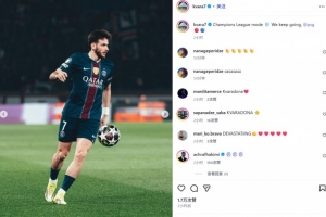 克瓦拉茨赫利亞也在賽后通過社媒曬出自己的比賽照,并配文:“歐冠模式?? 我們繼續前進,@巴黎圣日爾曼 ????”