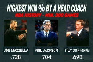 在至少執教300場比賽的主教練中,馬祖拉勝率72.8%歷史第一!菲爾·杰克遜70.4%第二,比利·坎寧安69.8%第三。